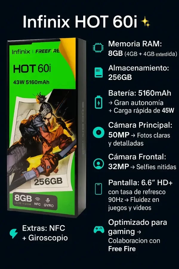 El Infinix Hot 60i es un smartphone diseñado para aquellos que buscan potencia y versatilidad en un solo dispositivo. Con un amplio almacenamiento de 256 GB y 8 GB de RAM, este celular te permite realizar múltiples tareas y almacenar tus aplicaciones, fotos y vídeos sin preocuparte por el espacio. Su procesador Helio G81 asegura un rendimiento fluido, ideal para los amantes de los juegos y el entretenimiento móvil.